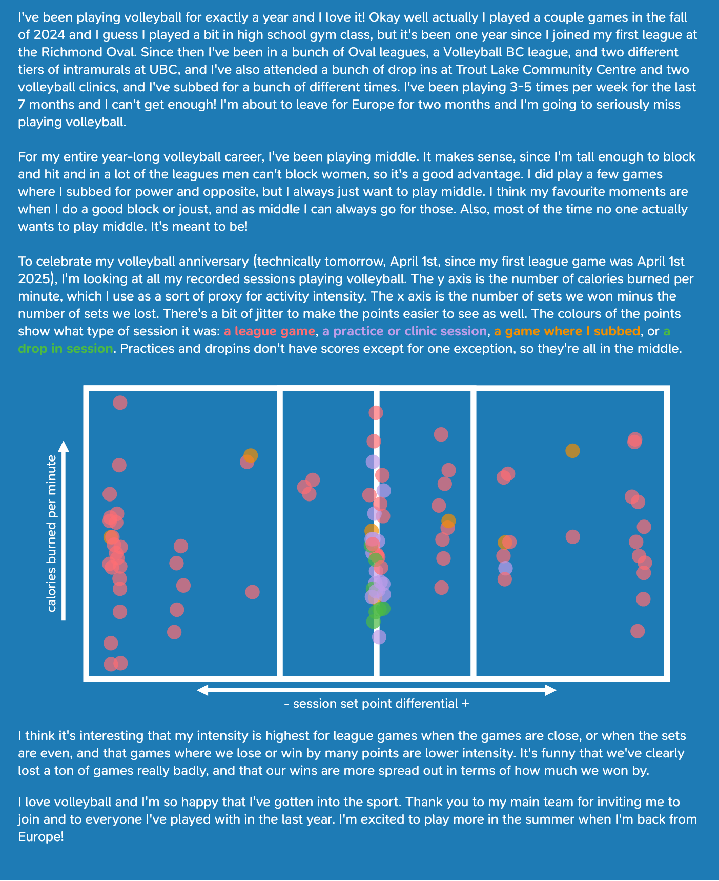 In 2025, I decided to make one visualization of something relevant to my personal life per month to hone my design skills and be creative with my skillset. These designs take the form of blog posts, where I have text interlaced with visualizations and images, and they tend to be more creative and artistic. I often spend time on the bus or while I'm in other in-between states thinking about ideas for what to visualize each month and ideating on the design, but I complete the dataset collection/curation and the implementation in one day of work.